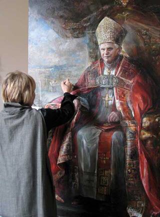 Leo en un despacho de la Agencia Efe que el Papa Benedicto XVI cumple ochenta años hoy, el 16 de abril, “y como regalo del propio Vaticano va a recibir un bonito retrato hecho por la pintura rusa Natalia Tsarkova (en la imagen)”. ¿Un bonito regalo? Echo un vistazo al retrato y distingo pose de poder y atavíos de pontífice: justamente lo mismo con que varios siglos atrás se presentaba Inocencio X. Sorprende el arcaísmo de dicho retrato, la antigüedad de su resolución, pero sorprende más la incomodidad del asiento.