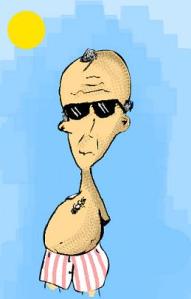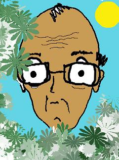 . Me hizo posar entre las flores, entre plantas y árboles. Como si estuviera oculto, saliendo de entre la maleza. Así es. Siempre que estamos disfrutando de unos días en la Serra d’Aitana, él me retrata con ese decorado: con algo de umbría, como si estuviera de incógnito, como si mi imagen la hubiera capturado de improviso. Me hace emboscarme tras hojas y tallos, entre tímido y dudoso y defensivo. En algunas ocasiones, la imagen expresa alegría, sonrisa franca; en otras, mi aspecto refleja estupor. Es el caso del retrato que ven. Miro, sí; pero miro con duda, con aturdimiento incluso. Quizá Monigote ha sabido observarme sin miramientos, precisamente; quizá ha sabido captar el estado de ánimo que las flores, la pose o el bronceado no ocultan, pues los ojos que ustedes ven muestran a un tipo desconcertado, sorprendido y temeroso: prematuramente envejecido, con una calvicie irreparable, con unas arrugas que ya roturan su piel. Acostumbro a retratarme sonriente. No digo cheese ni treinta y tres: fuerzo la impresión riéndome, que es el modo de aparecer menos apergaminado. No sé. Esta vez, la boca escueta no nos permite ver los dientes. El resultado es inapelable. Mi rostro expresa algo de azoramiento, un rictus triste, muy distinto del que ofrecía el turista que se retrataba en julio: desenvuelto, seguro, sin reparos.