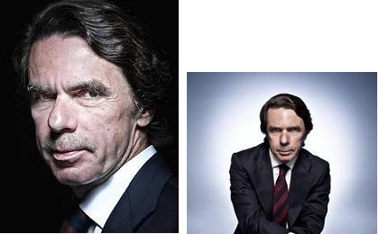 Confirmo el aire sombrío del ex presidente. Son fotografías de estudio, es decir, están hechas con la mejor iluminación, con la mejor intención. En la instantánea de la izquierda vemos un primer plano sobre fondo oscuro. Imagino que con este retrato se quiere dar impresión de serenidad, de fijeza, de solidez. Es la fotografía del jefe que podría presidir cualquier Consejo de Administración. En su composición se perciben poses milenarias de la tradición pictórica. Fíjense ahora en la imagen de la derecha, en el aura que rodea a Aznar. Destaca su figura sobre ese fondo claro, brillante. Lo circunda una aureola de luz difusa, como en un óleo religioso. Pero la composición es muy distinta: no hay arrobo. Adivinamos que tiene las manos cruzadas sobre sus rodillas, en una pose estudiadísima: ha de afectar relajación.