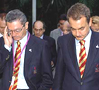 Vestidos con las americanas preceptivas, con los símbolos del COI, miraban aturdidos hacia algún punto del suelo, hacia abajo, como no atreviéndose a enfrentar los ojos de la ciudadanía, como si carecieran de ganas, de espíritu para afectar espíritu olímpico, precisamente. Lo mismo sucede con quienes les seguían, con Esperanza Aguirre, por ejemplo: consternados, ajenos, distantes, clavando sus ojos en el suelo que pisaban. Dicen los pies de fotos: el alcalde de Madrid y el presidente del Gobierno no disimulan su decepción al ser eliminada su candidatura en la tercera votación.