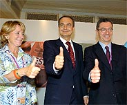 En la foto, el alcalde de Madrid aún parece mantener la compostura: tiene su celular pegado a la oreja, no sabemos si intentando comunicar con alguien o escuchando la voz de algún corresponsal telefónico. No habla: mantiene la boca cerrada. Como corresponde a los móviles más deslumbrantes y modernos, casi no se distingue, de lo escueto, de lo diminuto que es. Rodríguez Zapatero no habla ni escucha ni comunica con nadie: sólo mira hacia abajo. Se le distinguen unas pupilas extraviadas y los labios apretados, también con la boca cerrada, sellada, ajena a todo bla, bla, bla.