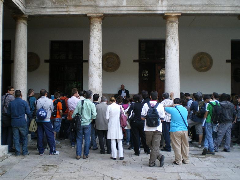 ¿Circular? En el claustro de la Universidad y como reclamo de la Exposición hay dos vehículos que vienen de otro tiempo. Un Fiat y una tartana. Estamos a principios del siglo XX. La velocidad cambia las formas de vida de los europeos de aquel tiempo. Nuevos ingenios que acortan distancias, que abrevian los tiempos. El mundo se mecaniza, se masifica, se apresura. Pero ese mismo mundo urbano aún conserva medios de locomoción antiguos y de uso rural.