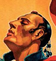 El individuo parece entregado al sueño o a un placer propiamente sensual. Su rostro severo, algo envarado, no añade dato alguno. Al observar el detalle de esta imagen no podemos saber lo que ocurre fuera de campo. Imaginemos: entorna los párpados para apreciar mejor un sonido que embriaga. ¿Un himno, una marcha militar, una cancioncilla? Los himnos se escuchan con el mentón levantado, mostrando respeto y aplomo marcial. Imaginemos: el varón retador atiende y se contiene. Ese mentón, justamente, alarga el rostro confirmando su masculinidad.