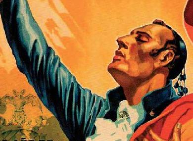2. ¡Arriba España! Ahora empezamos a verlo mejor. El personaje es un valenciano de guardarropía, un presunto huertano vestido de torrentí, no de torero. Sobre un fondo de farolillos y banderas victoriosas con el águila imperial, hace el saludo falangista. ¿Cuarenta y cinco grados preceptivos? Hemos de suponer que acaba de gritar Arriba España. O que está punto de vocearlo. Vuelvo a mirar el ojo del apócrifo huertano. La disposición del párpado parece incongruente. Si está cantando el himno falangista –el Cara al sol, que nos recuerda Marisa Bou–, entonces sorprenden la languidez o el éxtasis, esos ojos cerrados. O no: ahora me parece que ese párpado está entreabierto. En fin…