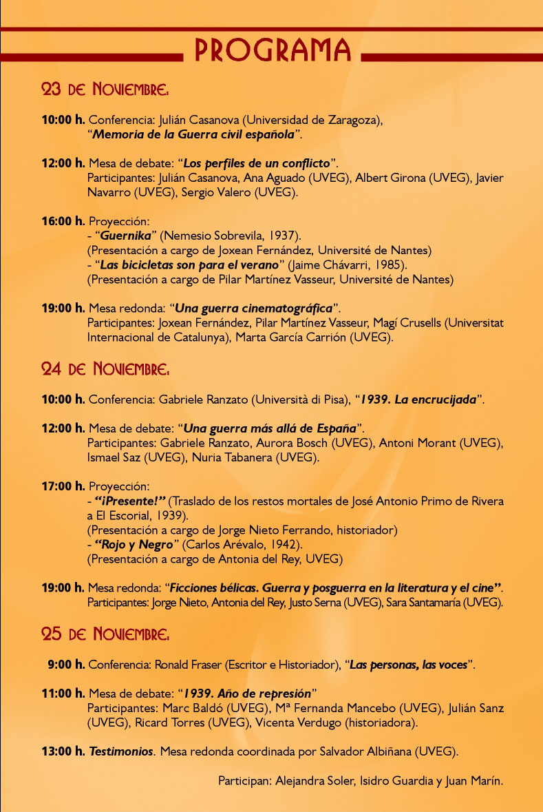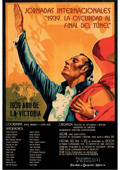 3. 1939. La oscuridad al final del tunel. Todo lo que precede lo he ido pensando y escribiendo para llegar a lo que quería anunciar. En la Facultad de Geografía e Historia de la Universidad de Valencia se desarrollan unas Jornadas Internacionales los días 23, 24 y 25 de noviembre. El título: 1939. La oscuridad al final del tunel. Es un programa ciertamente ambicioso con conferencias, mesas redondas y proyecciones de películas (aquí). Entre otros, acuden expertos como Julián Casanova, Gabriele Ranzato o Ronald Fraser. Y el cartel de las Jornadas es este que abajo reproduzco (pueden hacer click para verlo en tamaño mayor):