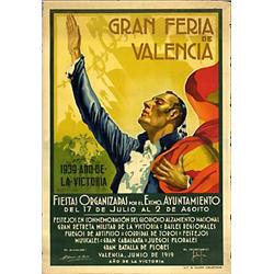 Ahora creemos entenderlo todo, ¿no es cierto? Alguien puede reprocharme este largo excursus. ¿He jugado con ustedes? No exactamente. Lo que he hecho desmenuza lo que el ojo ve o lo que creemos ver, lo que inmediatamente solemos pensar. Pasamos del detalle al entero, de la parte al conjunto, y de repente parece todo aclarado. El primer plano del rostro se prestaba a interpretaciones quizá equivocadas. ¿Es así? Cuando vemos el plano general, creemos entenderlo todo. En realidad, aún hay más. Dicho póster es una recreación de otro que vio la luz nada más acabar la Guerra Civil, con ese lema que figura en la parte izquierda inferior: «1939 · Año · de · la · Victoria«. El primitivo era un cartel anunciador de la «Gran Feria de Valencia«, del 17 de julio al 2 de agosto de… 1939.