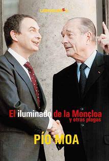 ¿Quién es el iluminado? Desde luego aquel que está en las nubes, aquel que está mirando las nubes. ¿Qué papel desempeña el otro personaje? Desde luego, se apodera de la escena con ese dedo y parece notársele un aire desenvuelto, dominador, y ello, además, siendo el huésped…, ¿en la Moncloa? Ya lo sabemos: quien mira con ese aire ensimismado es José Luis Rodríguez Zapatero; quien señala con energía campechana, franca, es Jacques Chirac. ¿Fue así la circunstancia? Insisto, la falta de datos permite manipular la imagen para reforzar un determinado sentido: se vacía ese significante y se rellena con el título y con los contenidos del libro. Pues bien, ése es el modo de operar de Pío Moa, el autor del libro. Utiliza la realidad a su antojo para que sus fuentes, sus vestigios, sus documentos (y esta foto es un documento más) digan lo que él quiere que digan.