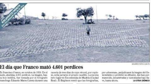 Peñafiel condena al Caudillo. «¿Qué vieron en estas fotografías las autoridades tanto de la casa de su Excelencia como del Ministerio de la Gobernación para impedir su publicación? Posiblemente la obscenidad de quien no tenía pudor en posar ante una masacre de inocentes perdices como la que recogen estas fotografías».