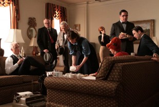 Pero, si nos fijamos bien, la composición está perfectamente estudiada, con una escenografía, un volumen y unos personajes debidamente colocados. Al fondo divisamos a la voluptuosa Joan Holloway, atendiendo el teléfono o haciendo una llamada. Hay un centro sobre el que gira todo: propiamente un centro de mesa sobre el que se inclina Peggy Olson, a punto de servir lo que parece un tentempié o un piscolabis. En poco espacio se concentran ocho personas, tres de ellas permanecen sentadas y las restantes de pie. Los conocemos bien: Sterling, Pryce, Cooper, etcétera.