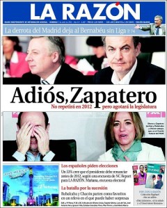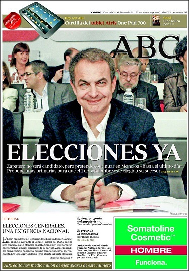 En Abc, el titular es desiderativo: “Elecciones ya” es la meta que el diario comparte con el Partido Popular. No hay tregua; no hay respiro. El enunciado tiene un fondo obvio, explícito: aparece un José Luis Rodríguez Zapatero con sonrisa inexplicable, parecen decirnos. Con sonrisa incongruente. Esa persona que sonríe y que tiene las manos cruzadas parece ajena a los males del país y se obstina en agotar la legislatura, en permanecer en la Moncloa hasta el último día. ¿Cabe mayor daño a la patria? ¿Cabe mayor irresponsabilidad? Hay un equipo de gentes del Partido Popular encabezados por Mariano Rajoy que sacarían a España de la crisis. No hay más. Mientras tanto, al actual presidente parece incomprensiblemente relajado.
