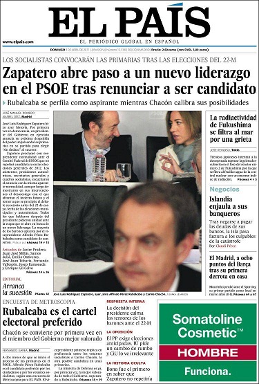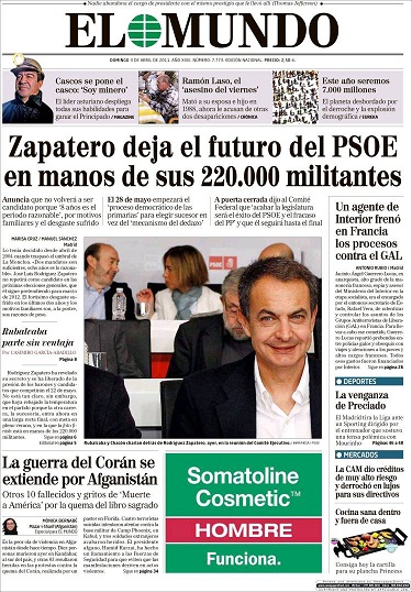 En El Mundo, el titular tiene dobles lecturas. Reza así: “Zapatero deja el futuro del PSOE en manos de sus 220.000 mil militantes”. ¿Qué parece decirnos? No que abandona la lucha electoral, sino que abandona el partido que lidera. No nos dice que se retira de la liza política, sino que deja el porvenir de su organización a una militancia huérfana. La interpretación parece igualmente obvia. ¿Quizá que las ratas son las primera en abandonar el barco? Mientras Rodríguez Zapatero sonríe a la cámara, ajeno a todo, al fondo vemos a Pérez Rubalcaba y a Carme Chacón conversando, dialogando o cuchicheando. Pero no: la fotografía de El Mundo tiene un pequeño detalle: Chacón levanta la mano izquierda, quizá el dedo. Tiene un aspecto enérgico. En realidad, Pérez Rubalcaba –el posible candidato que el periódico detesta— calla ante la resuelta Carme. De ahí que Casimiro García-Abadillo inicie su artículo de fondo con un epígrafe igualmente desiderativo: “Rubalcaba parte sin ventajas”.