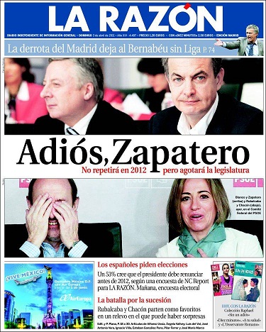 En La Razón, el titular es contundente, muy expresivo: “Adiós, Zapatero”. Es aparentemente descriptivo, pero es sobre todo un desprecio: el castizo diría que es semejante a un corte de mangas. Rodríguez Zapatero parece mirar al objetivo de la cámara pero con el ánimo ausente. ¿Y José Blanco? Mira para otro lado. O se equivocó de objetivo o no quiere saber nada. Alfredo Pérez Rubalcaba se tapa los ojos, se restriega las cuencas, y no sabemos si con ello el periódico nos dice que tenemos a un ciego como posible candidato. O a un tipo que no quiere ver. Y a Carme Chacón la vemos sonriente. Pero la suya es casi una mueca: entre el miedo y la irresponsabilidad. Como si la posible candidata no supiera muy bien qué hacer ante lo que se avecina.