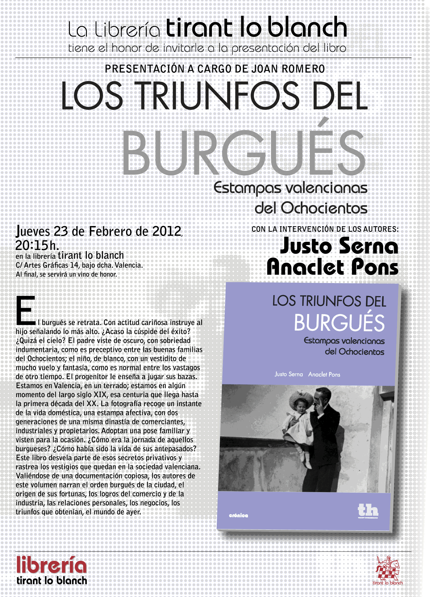 Dos. En El País publico un artículo que he titulado Los burgueses de Valencia. Es una columna en la que indico apretadamente qué pueden encontrar en este libro que se presenta ya mismo, el jueves 23 de febrero, en la Librería Tirant Lo Blanch de Valencia (Artes Gráficas, 14). A las 20:15 horas. Tras el acto habrá un piscolabis muy cumplido que debemos a la generosidad del editor: desde vino a tortilla de patatas con otras delicatessen. ¿Se lo van a perder?