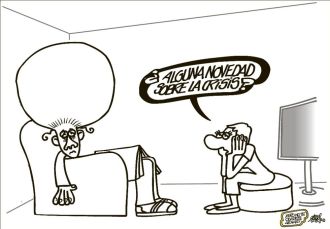 multiplicidad de datos contradictorios. Nos invaden el desconcierto y lo ilusorio. El desconcierto, en el sentido de la decepción y de la frustración; y lo ilusorio en el sentido de la irrealidad y la confusión. Tenemos la cabeza como un bombo, según vemos en la viñeta de Forges para El País del 10 de julio de 2012. La dama está inquisitiva y aburrida; el tipo está derrengado y ojeroso; la tele está apagada, inane; y el periódico boca abajo: no se le caen las letras.