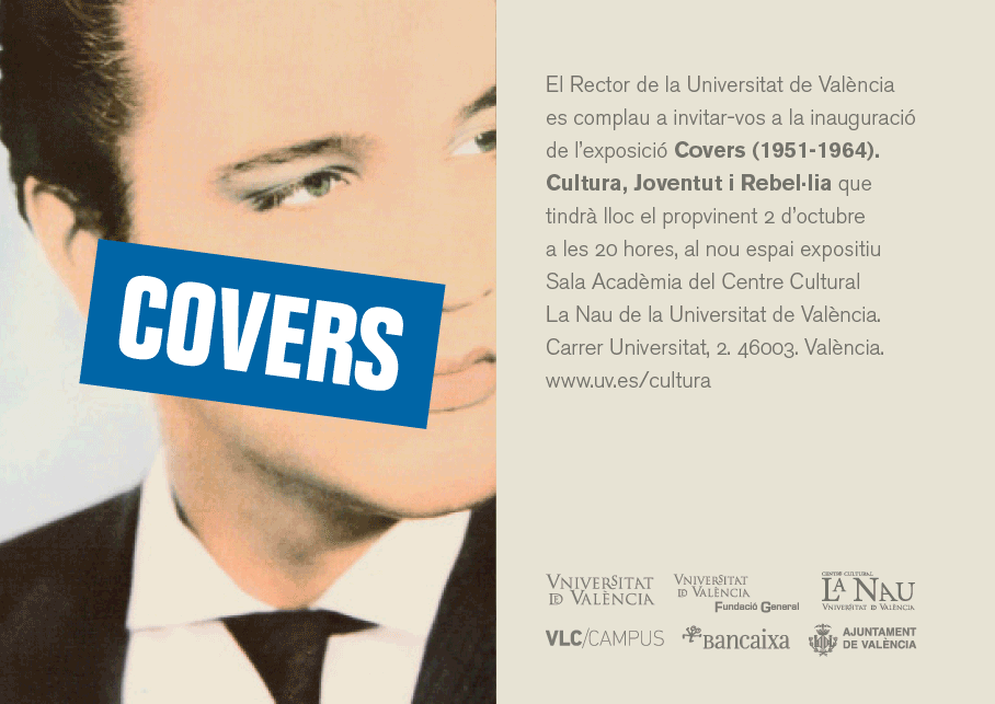 Sin embargo, la dicha material también oculta distintos malestares. Uno de ellos es el de la juventud: muchachos cada vez más inquietos –a los que se les ve con preocupación– parecen despreciar esa prosperidad. Desde mediados de los años 50 comienzan a vestirse de otra manera, con ostentación y uniformidad, con indumentarias que los distinguen: blue-jeans, cazadoras de cuero o pantalones de pitillo. Lo hacen disfrutando de canciones que expresan sus incomodidades y sus anhelos: el sexo, el trabajo, la velocidad. La música y la apariencia revelan su identidad de pioneros, el origen de la contestación, de aquella rebeldía juvenil que lo cambió todo. Queremos observar sus valores, propios o repetidos, sus modelos de conducta y comportamien- to, lo que fue portada de los discos, lo que tuvo cobertura. Por eso, esta Exposición se titula así: Covers. Es una referencia a lo que las cubiertas –de los discos, de las revistas, por ejemplo– dejaban ver y ocultaban, a lo que mostraban y tapaban: vinilos de Luis Puig (nuestro coleccionista particular); primeras planas de Life y Time que la Universitat de València atesora; electrodomésticos de Alfaro Hoffmann. Todo el aire de una época ya desaparecida.