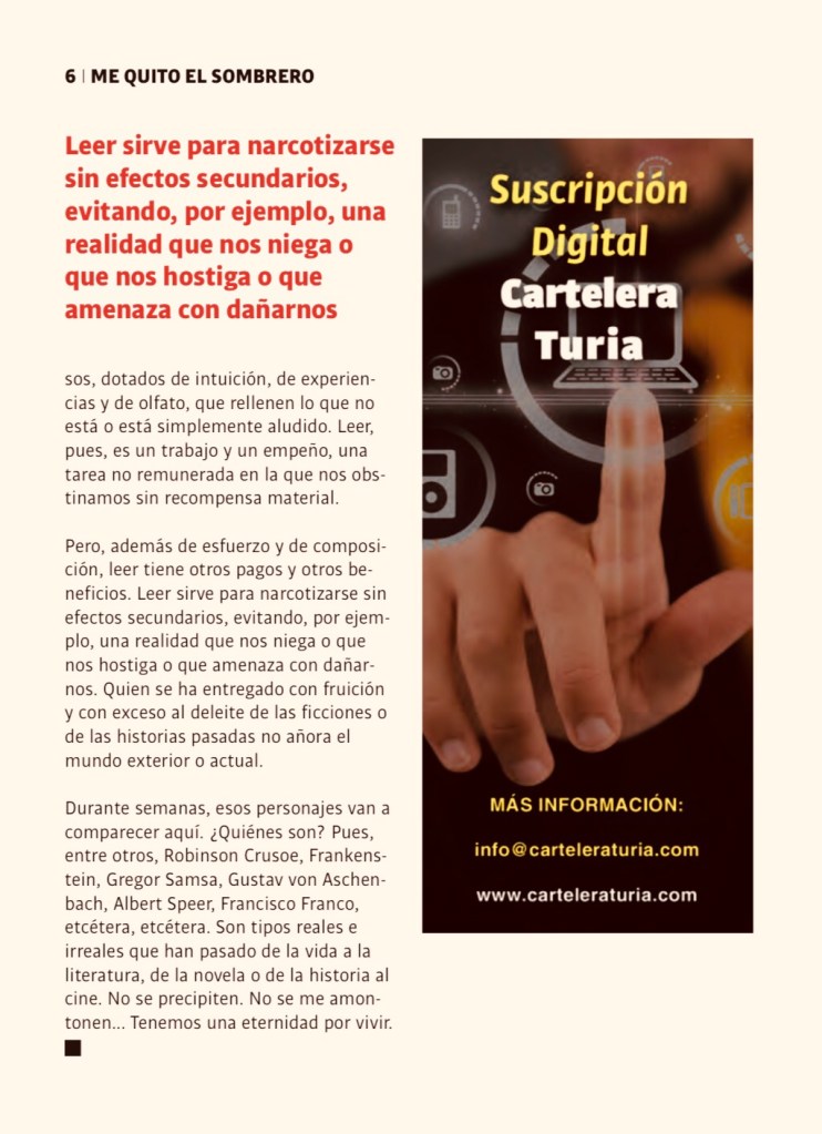 En esta serie de Cartelera Turia que ahora se inicia propongo reconocer eso mismo: que somos personas habituadas a leer, que aspiramos a sacar el mayor rendimiento de dicha operación para aliviarnos o para complicarnos la vida.