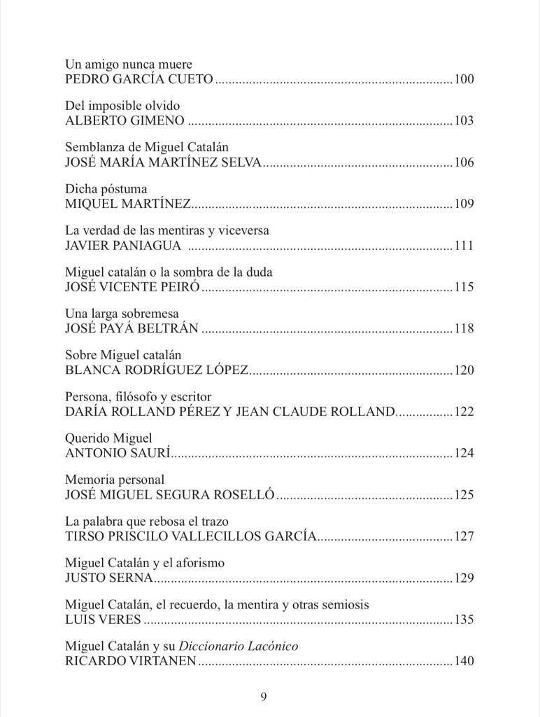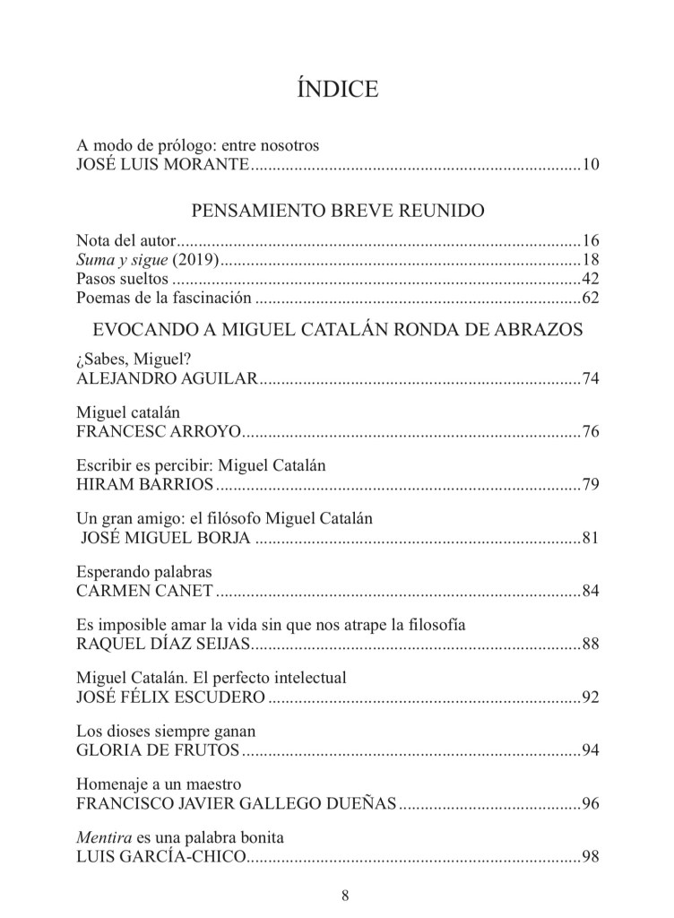 Este libro se lo debemos a Maria Picazo: al empeño, bendito empeño, de Maria Picazo. Reúne una miscelánea de aforismos y poemas. Y convoca a un grupo de amigos, seguidores y lectores de Miguel Catalán, del mundo académico y de otros ámbitos.